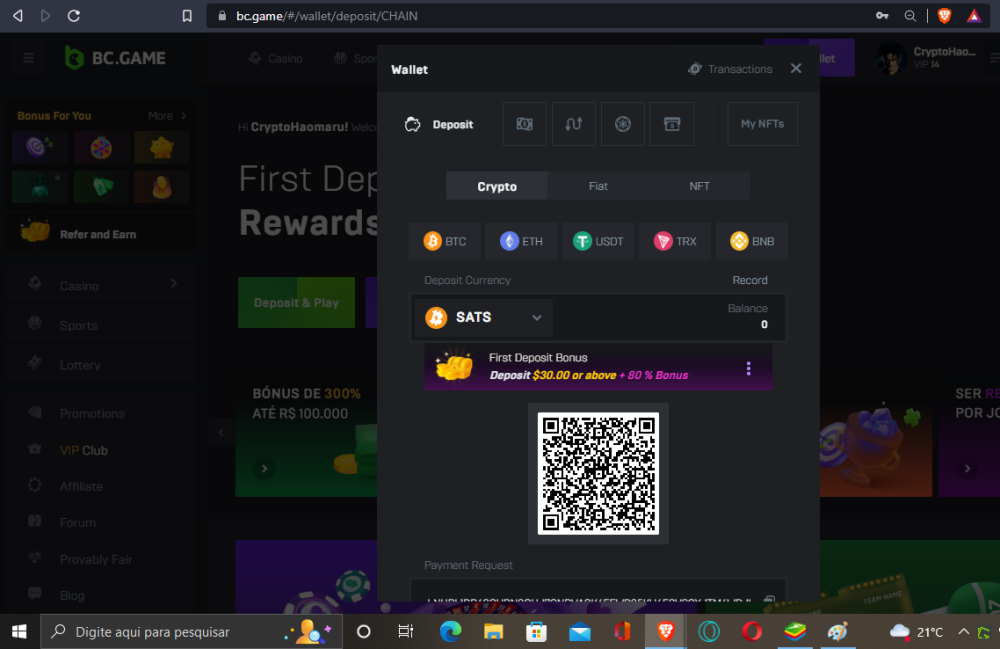 1. Website URL ( https://bc.game/pt/#/wallet/deposit/CHAIN) Device & System ( PC Windows 10 - 64 bits) Feedback / Live bug / User experience. ( The bitcoin satoshis deposit (SATS) screen does not appear completely. ) Journey ( In Chrome, Brave and Opera browsers the screen does not show all data for depositing bitcoin satoshis (SATS). ) Website URL ( https://bc.game/#/wallet/withdraw) Device & System ( PC Windows 10 - 64 bits) Feedback / Live bug / User experience. (The bitcoin satoshis withdraw (SATS) screen does not appear completely.) Journey ( In Chrome, Brave and Opera browsers the screen does not show all the data for withdrawing bitcoin satoshis (SATS). )