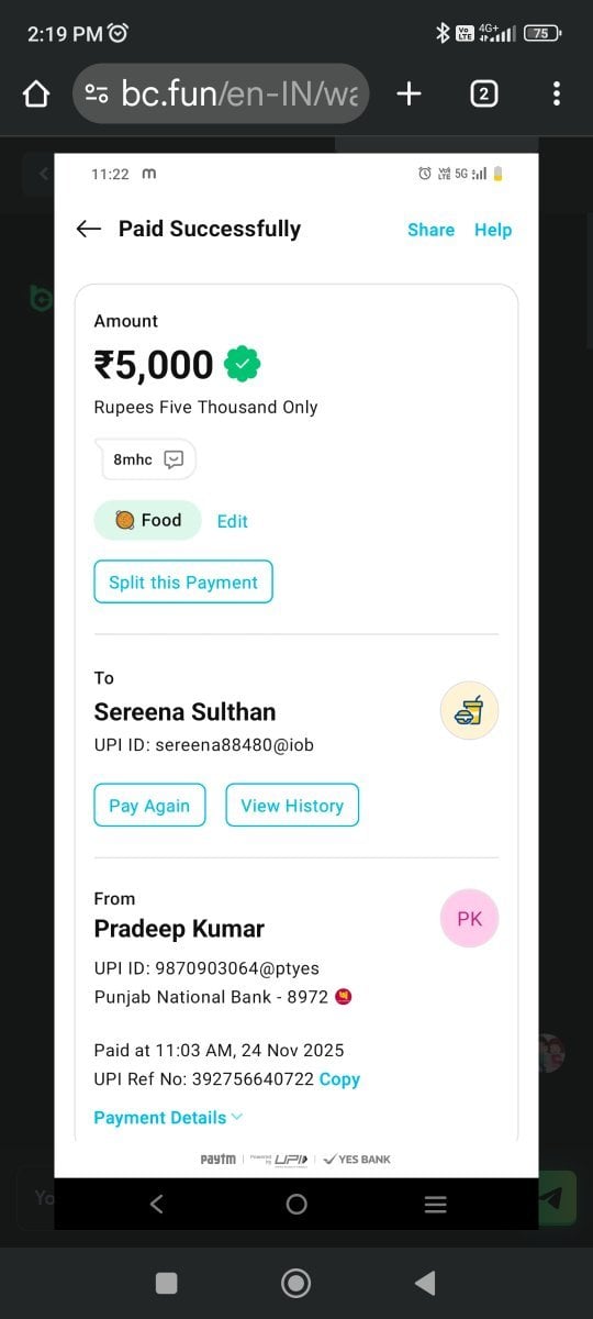 1. Dear BC.Game Support, Moderators & Admin, I am escalating this publicly because my ticket has been completely ignored for 14+ days. Deposit Details: Amount: ₹5,000 Date & Time: 24-Nov-2025, 11:03 AM IST UPI Ref No: 392756640722 Recipient: Sereena Sulthan (sereena88480@iob) My Bank: Punjab National Bank (Payment 100% successful) Order ID: F-1849648644640825672 Ticket ID: 9491468 (Still showing Pending) Current Status on site: “Under Review – 7-Day Full Manual Credit” → 14 days ho chuke hain, 0 INR credited Screenshots attached: Paytm/UPI successful payment proof BC.Game deposit page showing “Under Review” This is clearly not normal. BC.Game deposits never take 7-14 days for “manual review”. If this ₹5,000 is not credited to my wallet within the next 24 hours, I will be forced to: File official complaint on cybercrime.gov.in Report to RBI Ombudsman for UPI fraud