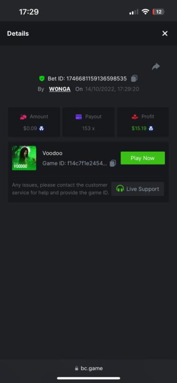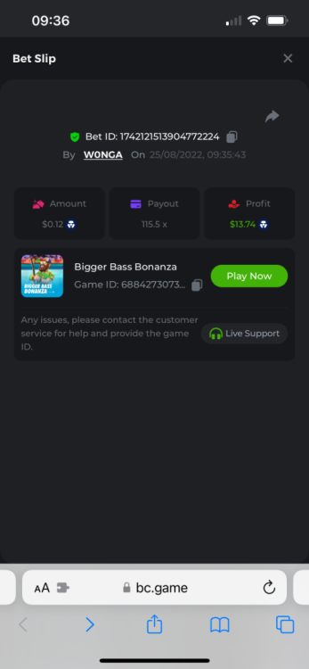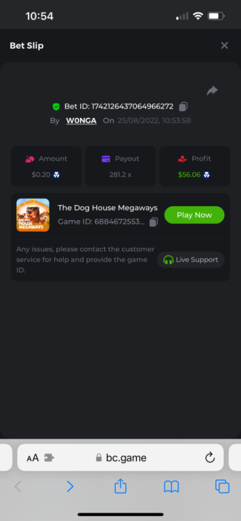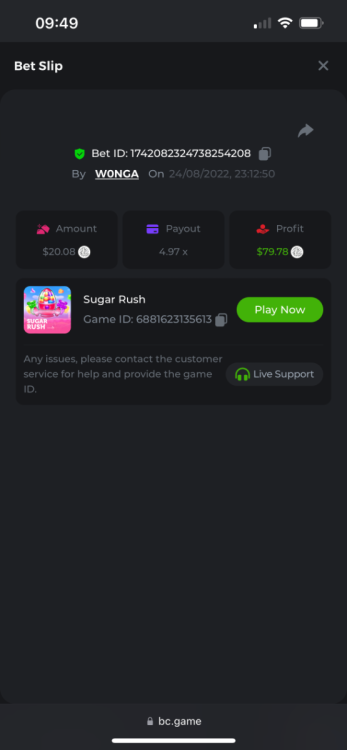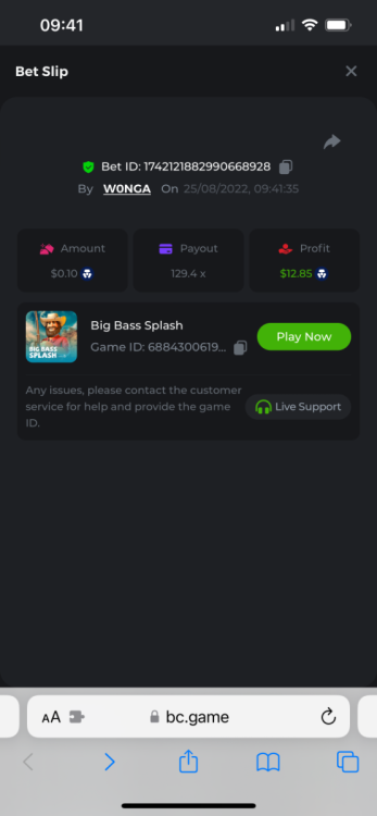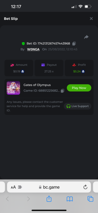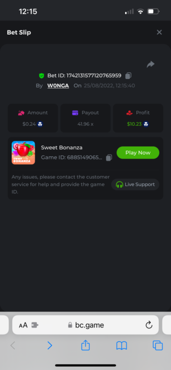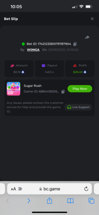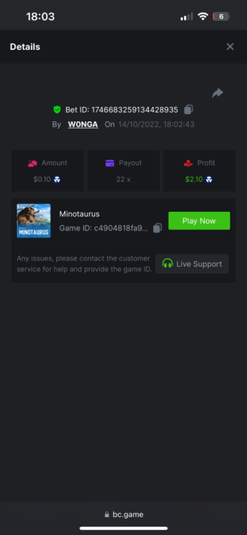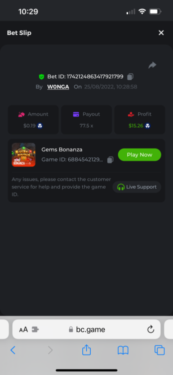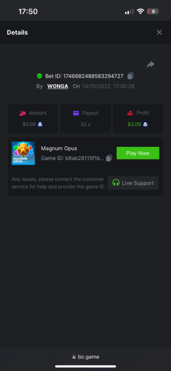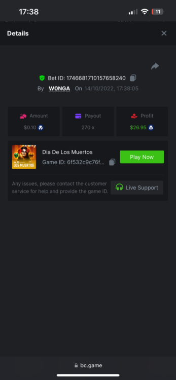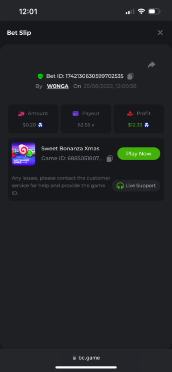 https://bc.game/#/sd/10YFF23M9VN76B This was a clean 50x win on $0.10! But the the dollar conversion says different. https://bcgame-dk2.pragmaticplay.net/gs2c/lastGameHistory.do?symbol=vs10bbbonanza&mgckey=AUTHTOKEN@11cc628b718a1c586678b11736e84ea3dfa730c7917478308de6e25bef028d13~stylename@bcgame_bcgame~SESSION@23942c19-4f81-4335-ac9a-6cefff7f9a75~SN@192ffaf4&tz=-00%3A00&mgckey=AUTHTOKEN@11cc628b718a1c586678b11736e84ea3dfa730c7917478308de6e25bef028d13~stylename@bcgame_bcgame~SESSION@23942c19-4f81-4335-ac9a-6cefff7f9a75~SN@192ffaf4 https://bc.game/#/sd/10YFG753VMQS5V https://bc.game/#/sd/10YFGJAIT2RMS3 https://bc.game/#/sd/10YFGXMC5YV8K3 https://bc.game/#/sd/10YGZ4VK6RWOIB -