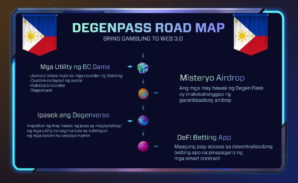 13. ......DEGEN PASS....... ROADMAP Bring Gambling to WEB 3.0 Mga Utility ng BC Game -Jackpot share mula sa mga provider ng iGaming -Custom na layout ng avatar -Rakeback booster -Degenback Enter Degenverse Ang lahat ng mga may hawak ng pass ay magbabahagi ng mga utility na nagmumula sa koleksyon ng mga casino na kasosyo namin Mystery Airdrop Ang mga may hawak ng Degen Pass ay makakatanggap ng garantisadong airdrop DeFi Betting App Maagang pag-access sa desentralisadong betting app na pinapagana ng mga smart contract