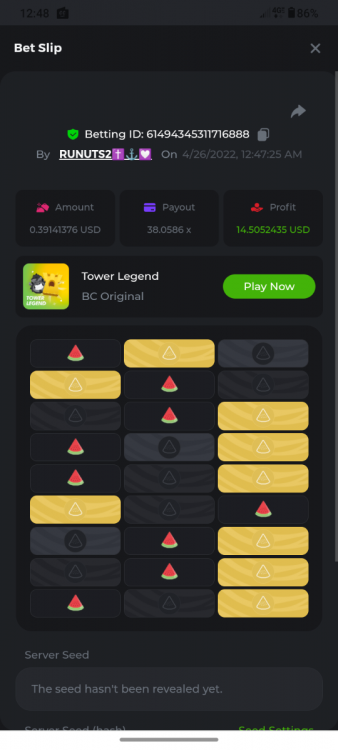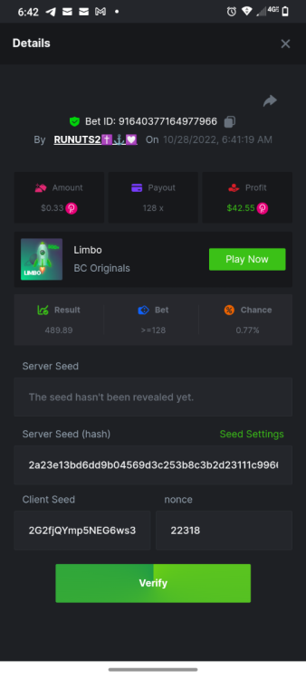 1. 16x | 26x | 27x | 29x | 33x | 37x | 43x | 56x | 58x | 76x | 83x | 88x | 110x | 120x | 130x | 170x | 260x | 420x | 620x | 1000x Some bets say 09 cents but showed $0.1 when I did the bet https://bc.game/#/sd/11FZ13ER2KDUZR https://bc.game/#/sd/11FZ1O7RLXAK9Z https://bc.game/#/sd/11FZ20E4G643PN https://bc.game/#/sd/11FZ2B9RQX25LV https://bc.game/#/sd/11G65L0NGEB7PN